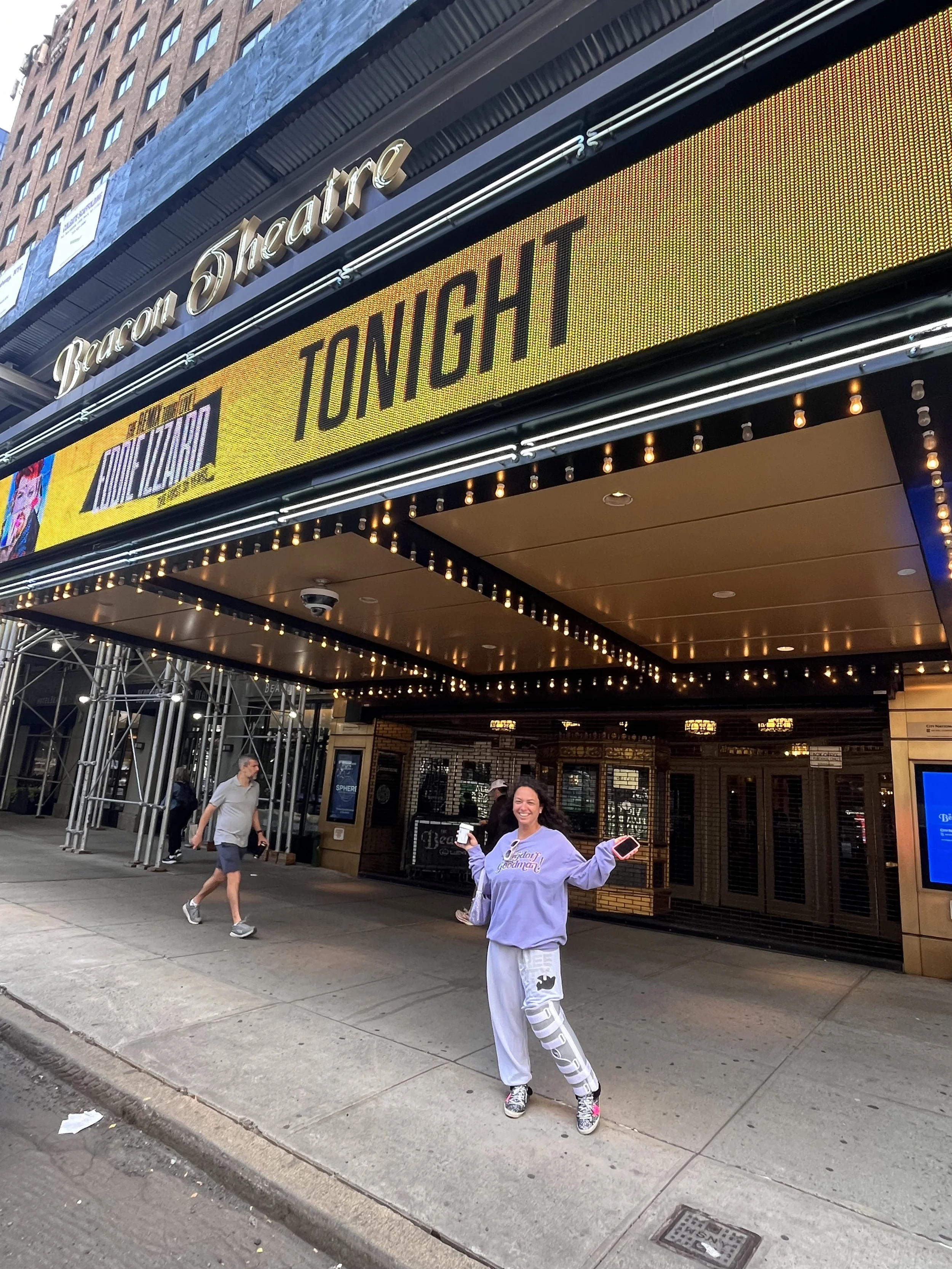 Earlier today, we walked past the Beacon Theatre, where we snapped some quick pics before heading to the grocery store and making a pit stop at none other than Sephora before heading home for some R&R. Outside of the iconic theatre, I’m wearing my signature rhinestone-embellished sweatshirt designed by Christopher John Rogers for Bergdorf Goodman, a matching Prada re-edition purse also in purple rhinestones, plus cozy free city sweats and the icing on the cake that needs no introduction: my new knee brace (official name pending).